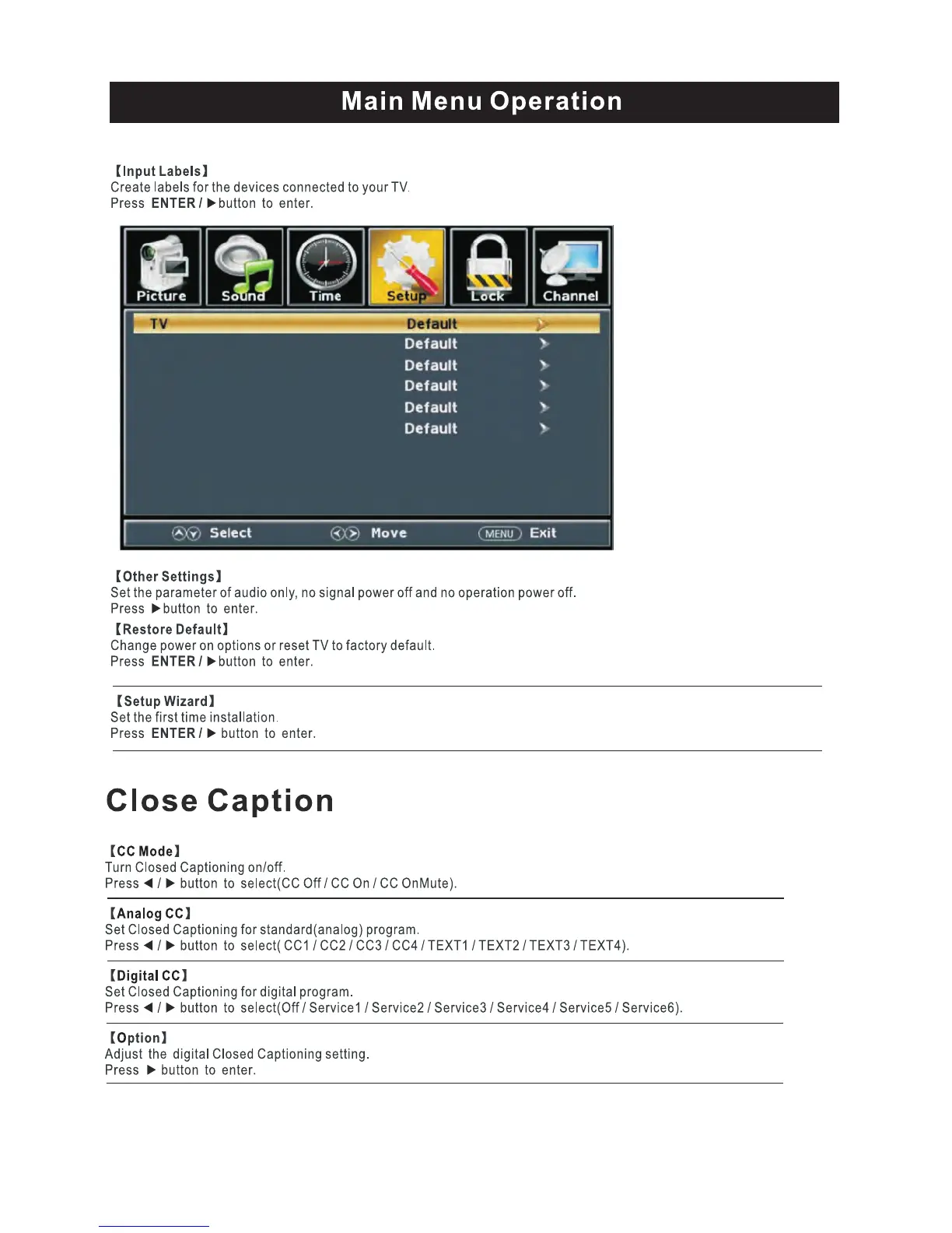 ProScan PLED2243A-C - Setup Menu Options; Closed Caption Settings; Input Label and Other Settings; Restore Default and Setup Wizard