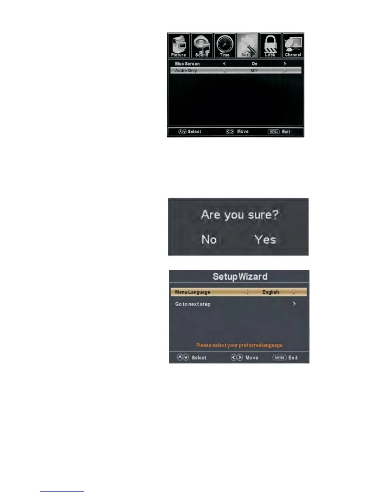 b. Press “c/d” button to select “Blue Screen” the “e/f” button to select “On” or “Off”.