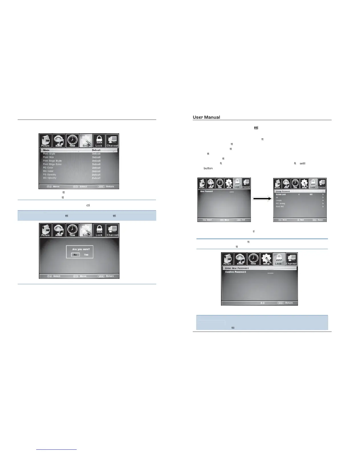 Restore Default Restore all se ngs in SETUP menu to factory se ngs.