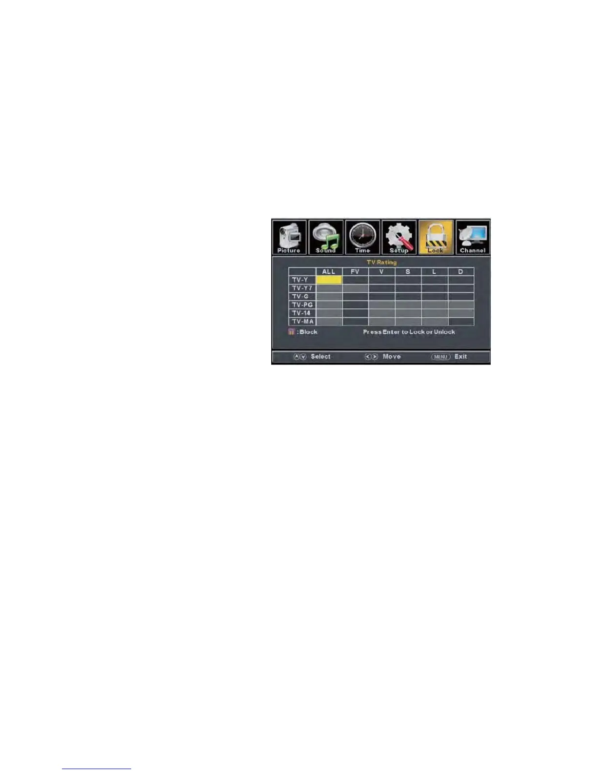 Canada »), puis appuyez sur le bouton « e/f » pour sélectionner « Off/C/C8+/G/PG/14+/18+ ».