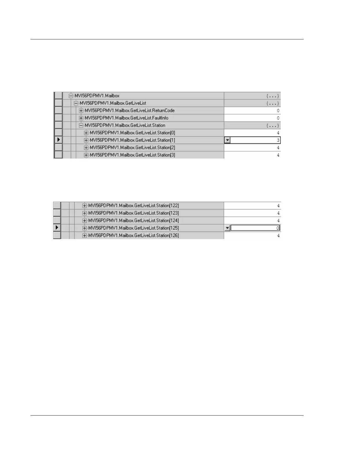 6 Next, expand the tag MVI56PDPMV1.Mailbox.GetLiveList.Station, to verify