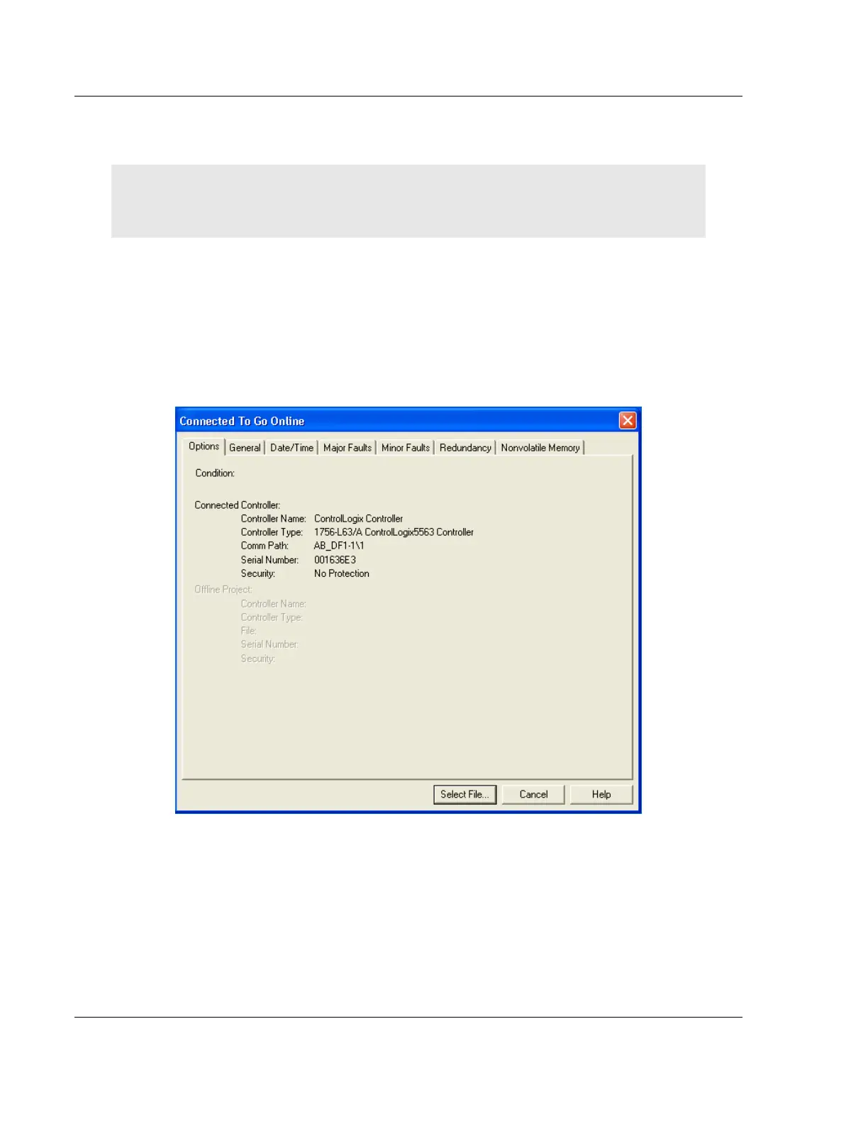 3 Open the COMMUNICATIONS menu and choose GO ONLINE. RSLogix will