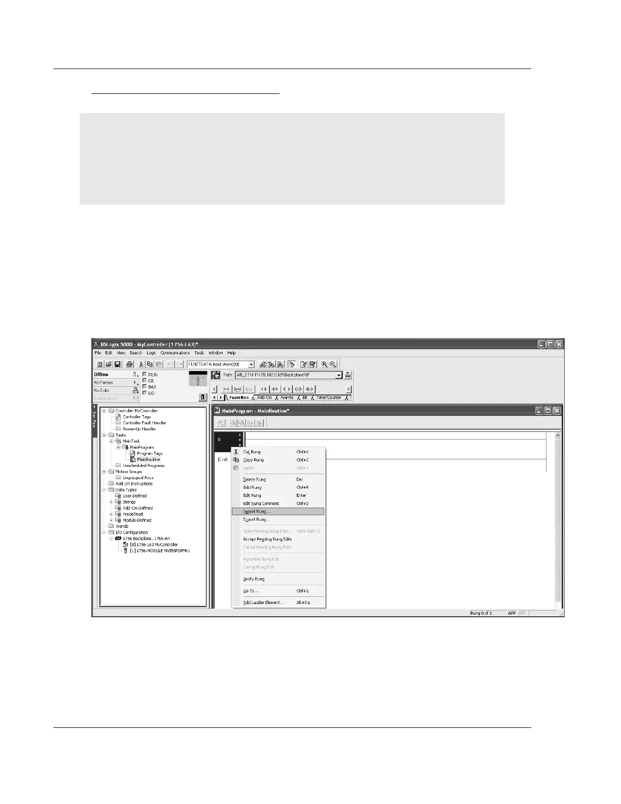 5 Select an empty rung in the new routine, and then click the right mouse