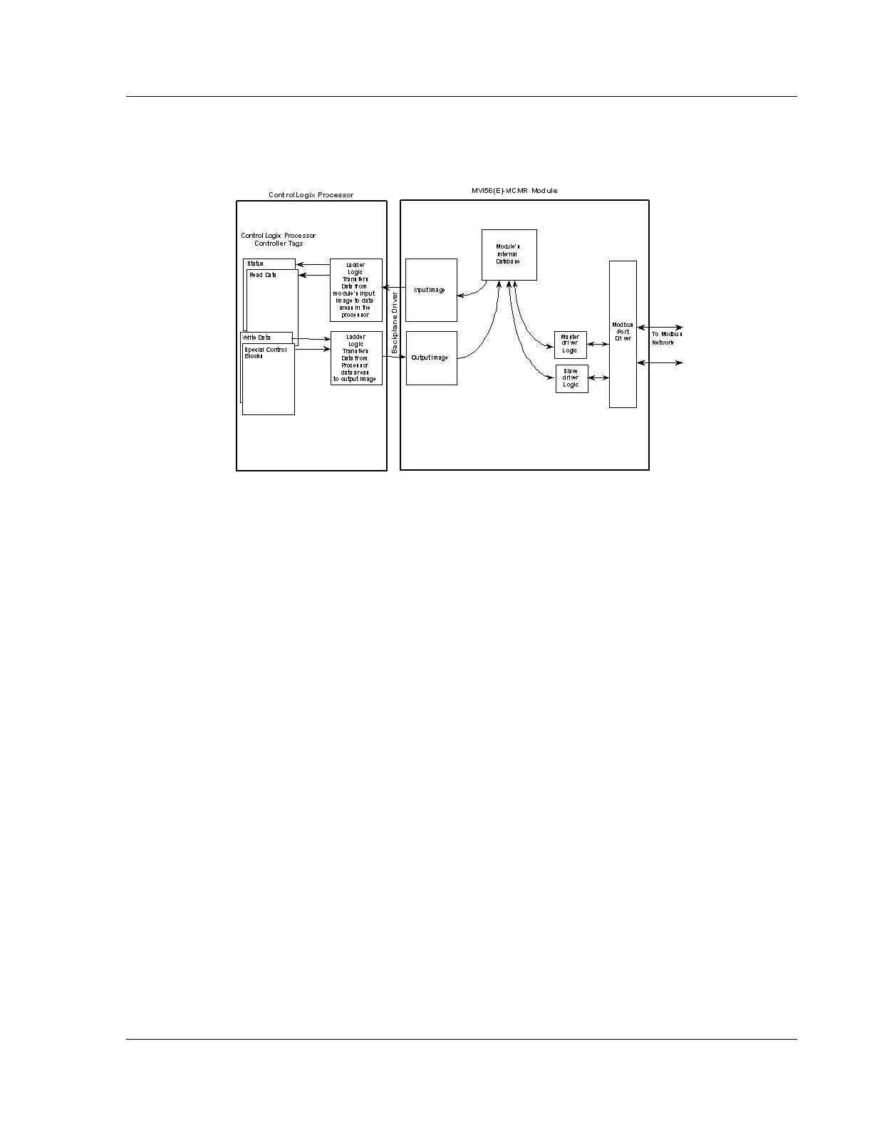 between the ControlLogix processor, the MVI56E-MCMR module, and the serial