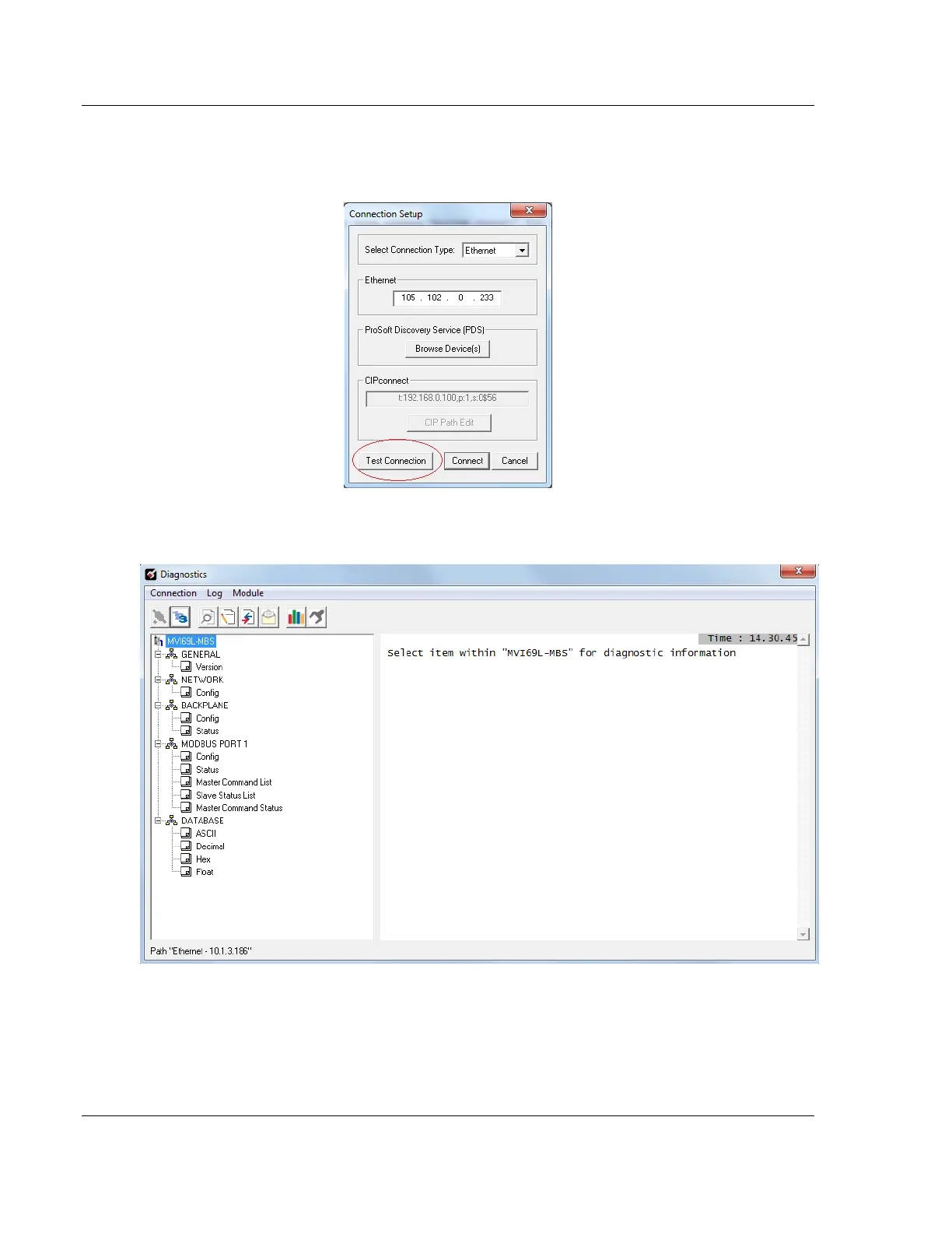 4 If the TEST CONNECTION is successful, click CONNECT. The Diagnostics
