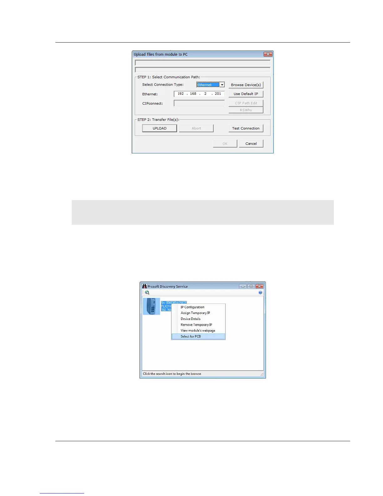 2 In the Upload dialog box, click BROWSE DEVICE(S) to open ProSoft Discovery