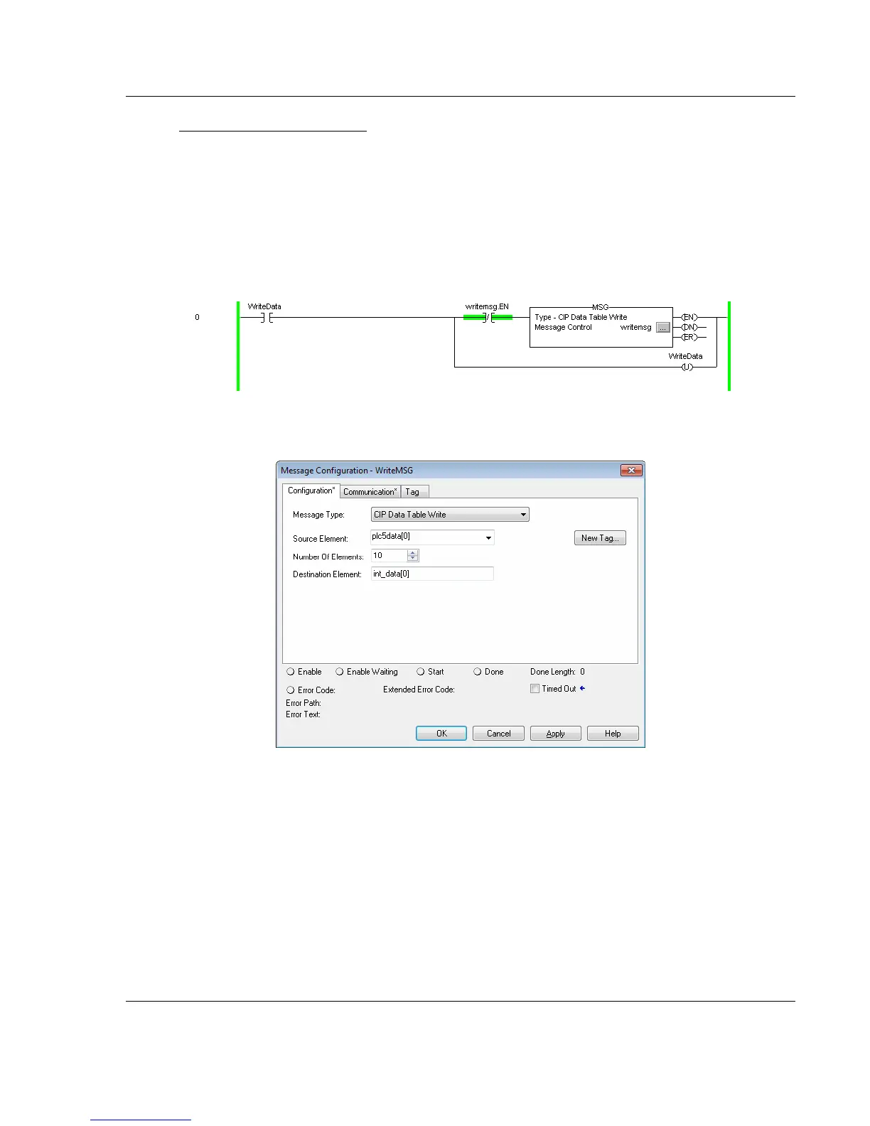 The following diagram shows an example rung that executes a write command.