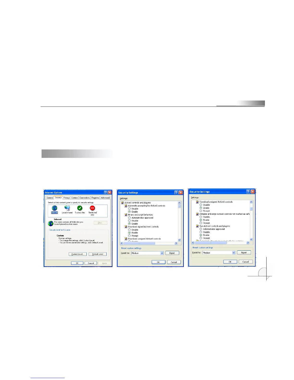 Level” button to enter Security Setting, and enable the 7 options that are related to ActiveX. Click “OK” button