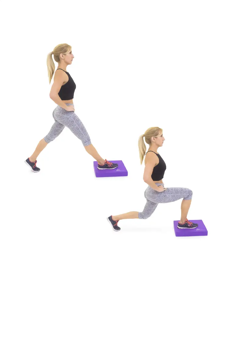 Step backward off the pad with one foot, coming down into a lunge (both