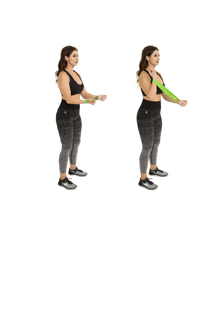 Place a band around both wrists, then bend elbows at 90 degrees with