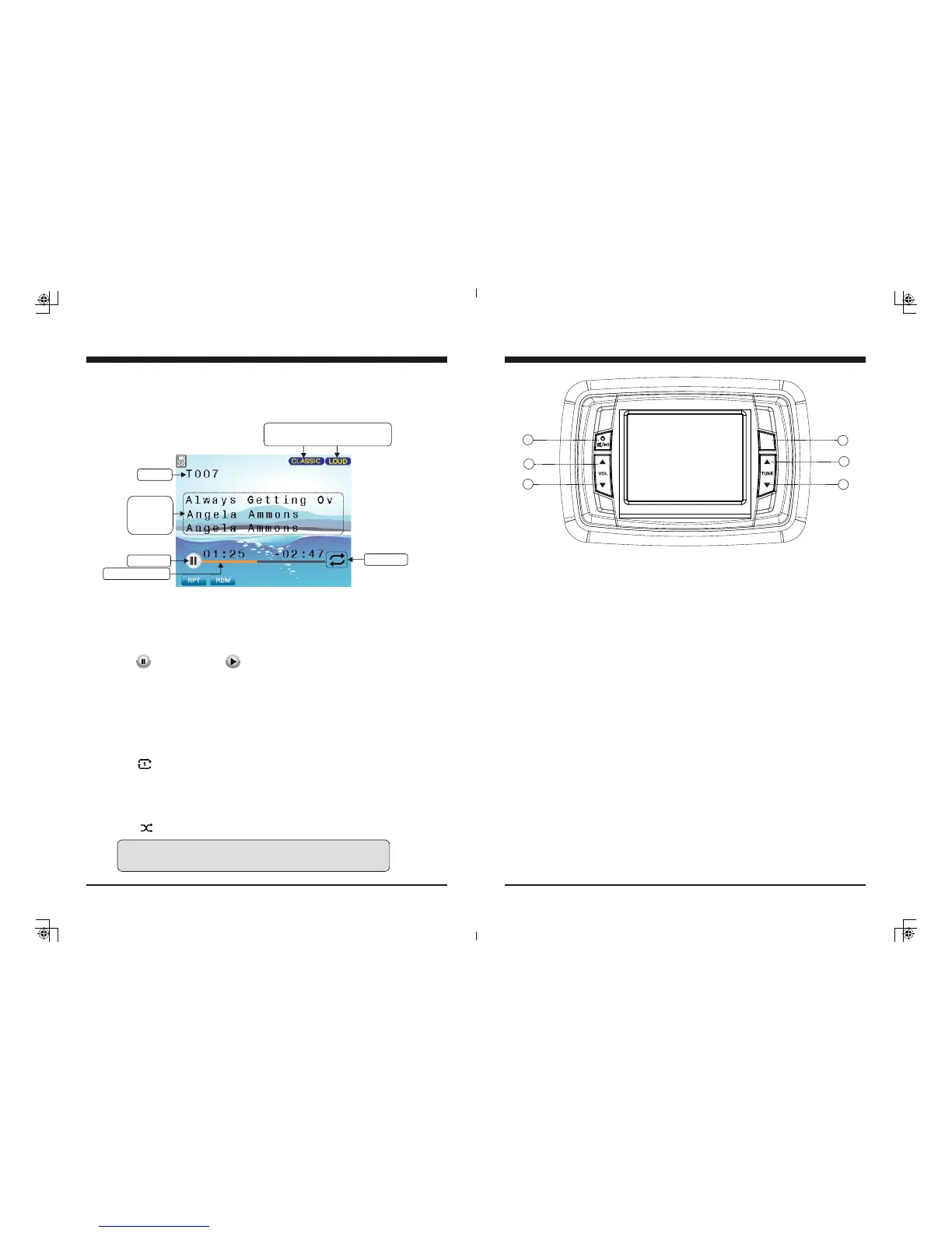 - In USB, BT Music mode, press to PAUSE playback, press again