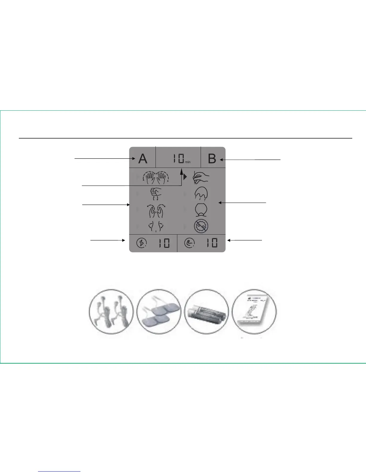 Two sets of cables, four pads, operating manual and 2 AAA batteries