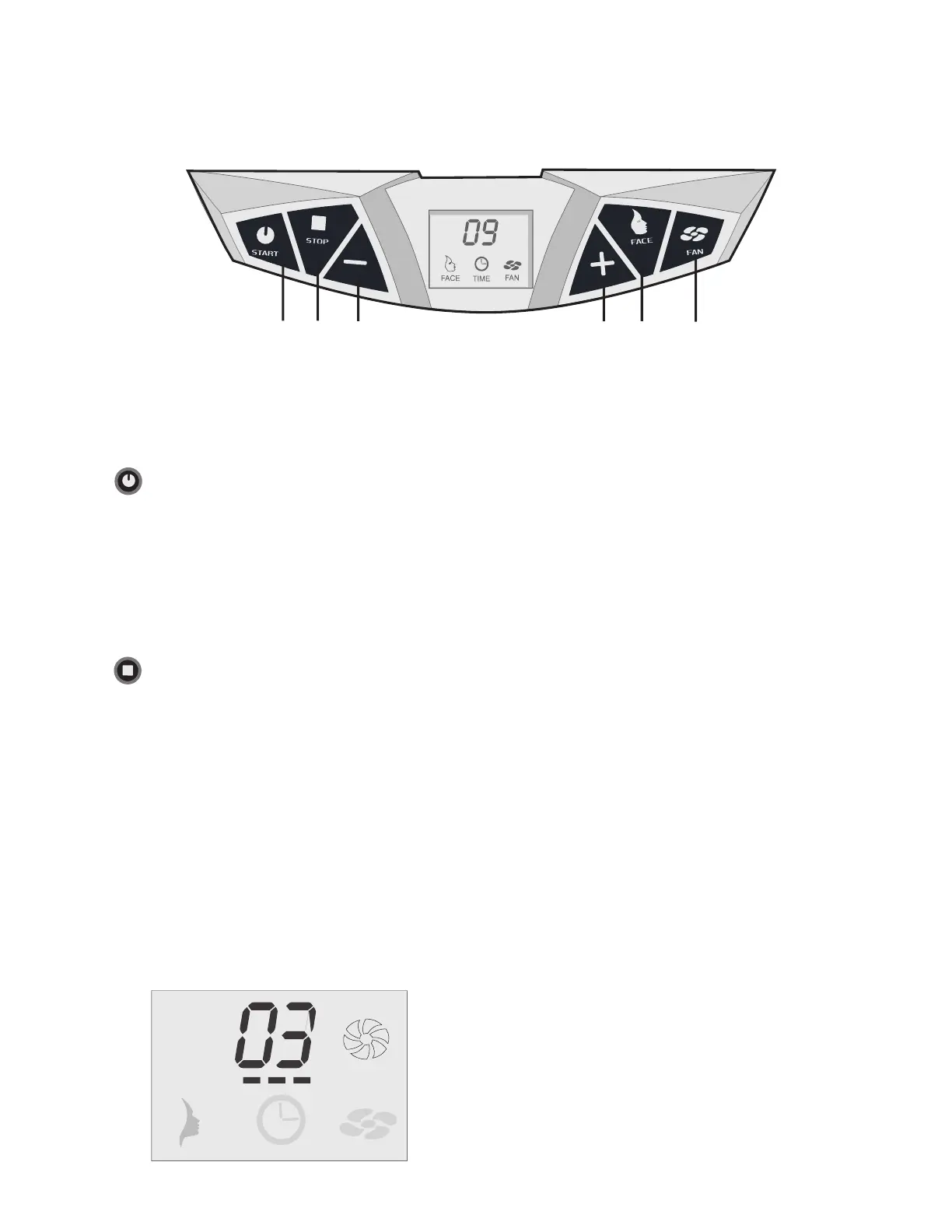 By depressing start once the “+ and –“ buttons can be used to set the tanning time.