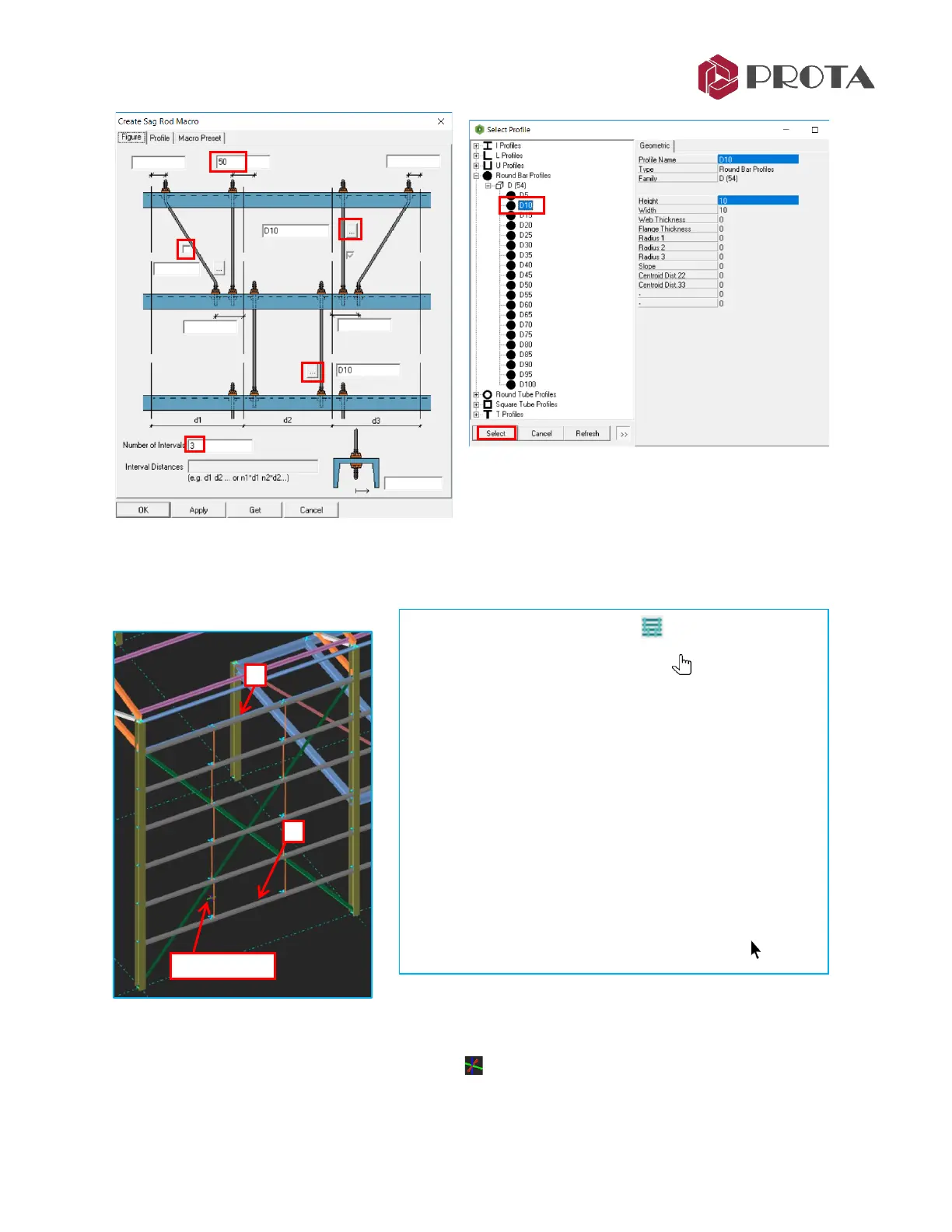 Each sag rod has its individual properties & can be selected, deleted or changed.