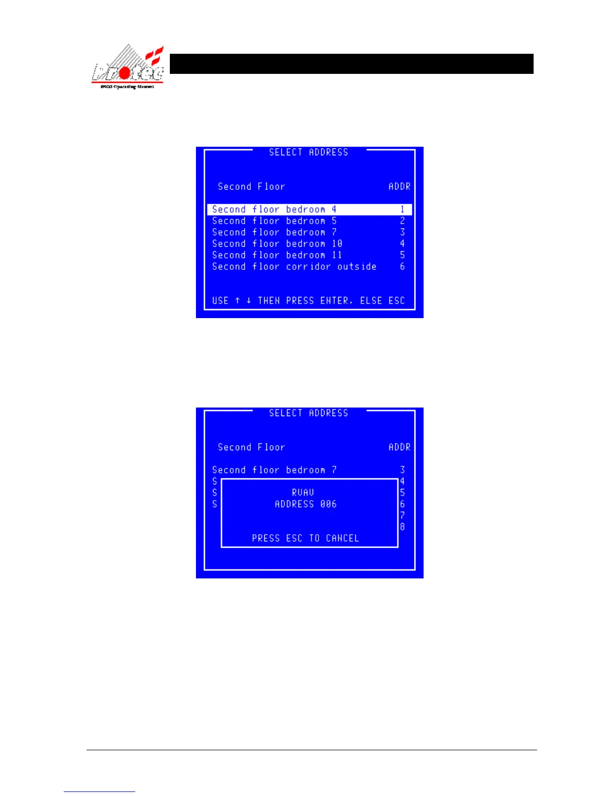 • Select Address : Use the highlight bar to select the address to test then press the ‘Enter’ key. A box will appear
