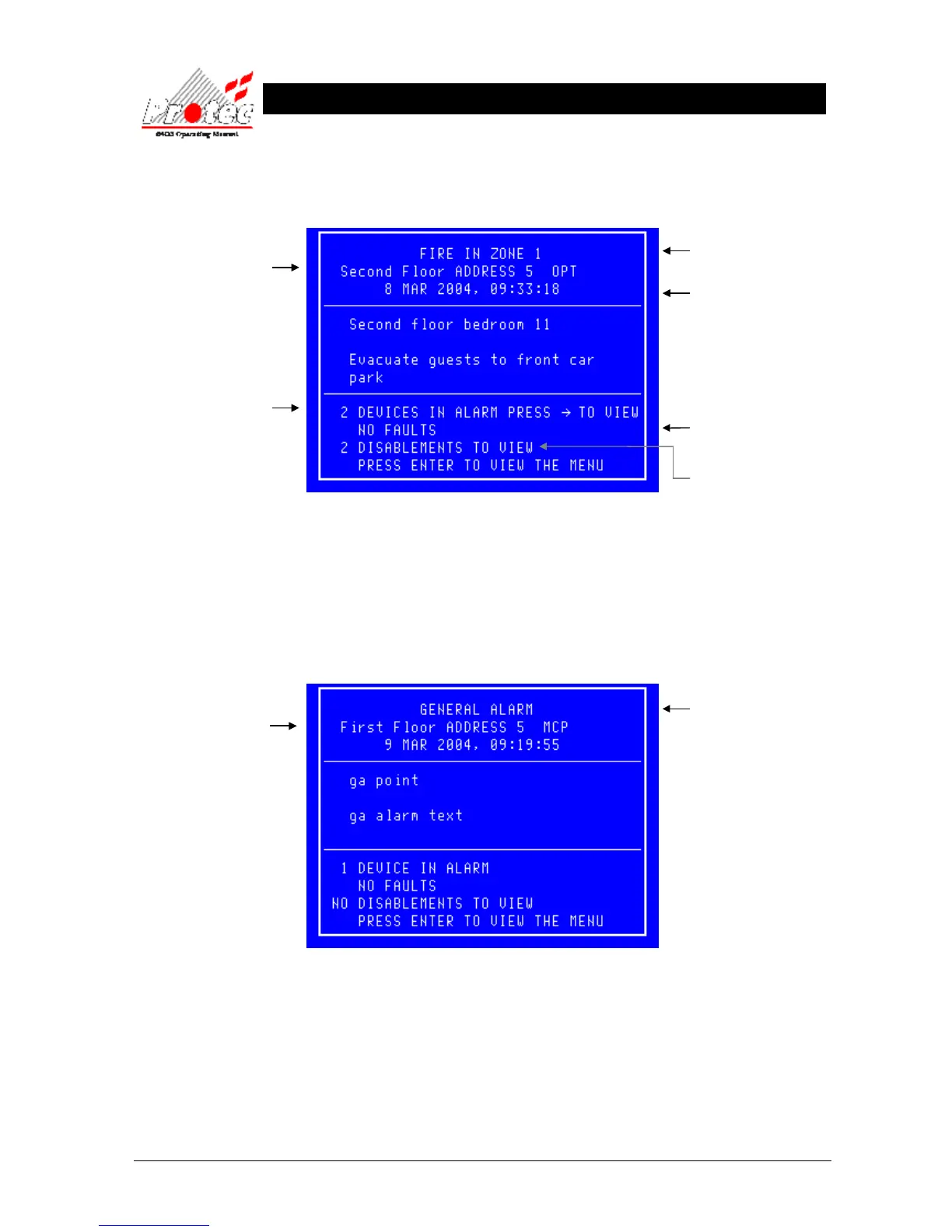 Pressing the → key will scroll the display to show the description of each device in an alarm condition.