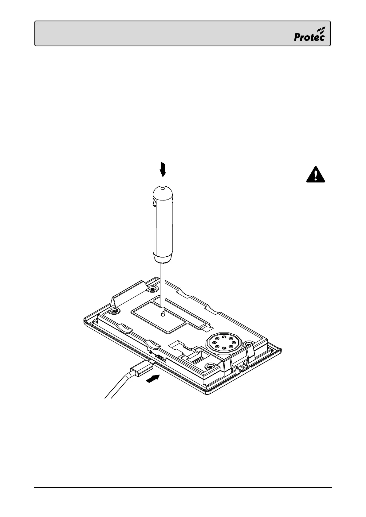 Using a small terminal screwdriver (e.g. 2.5mm), gently push and hold on the programming