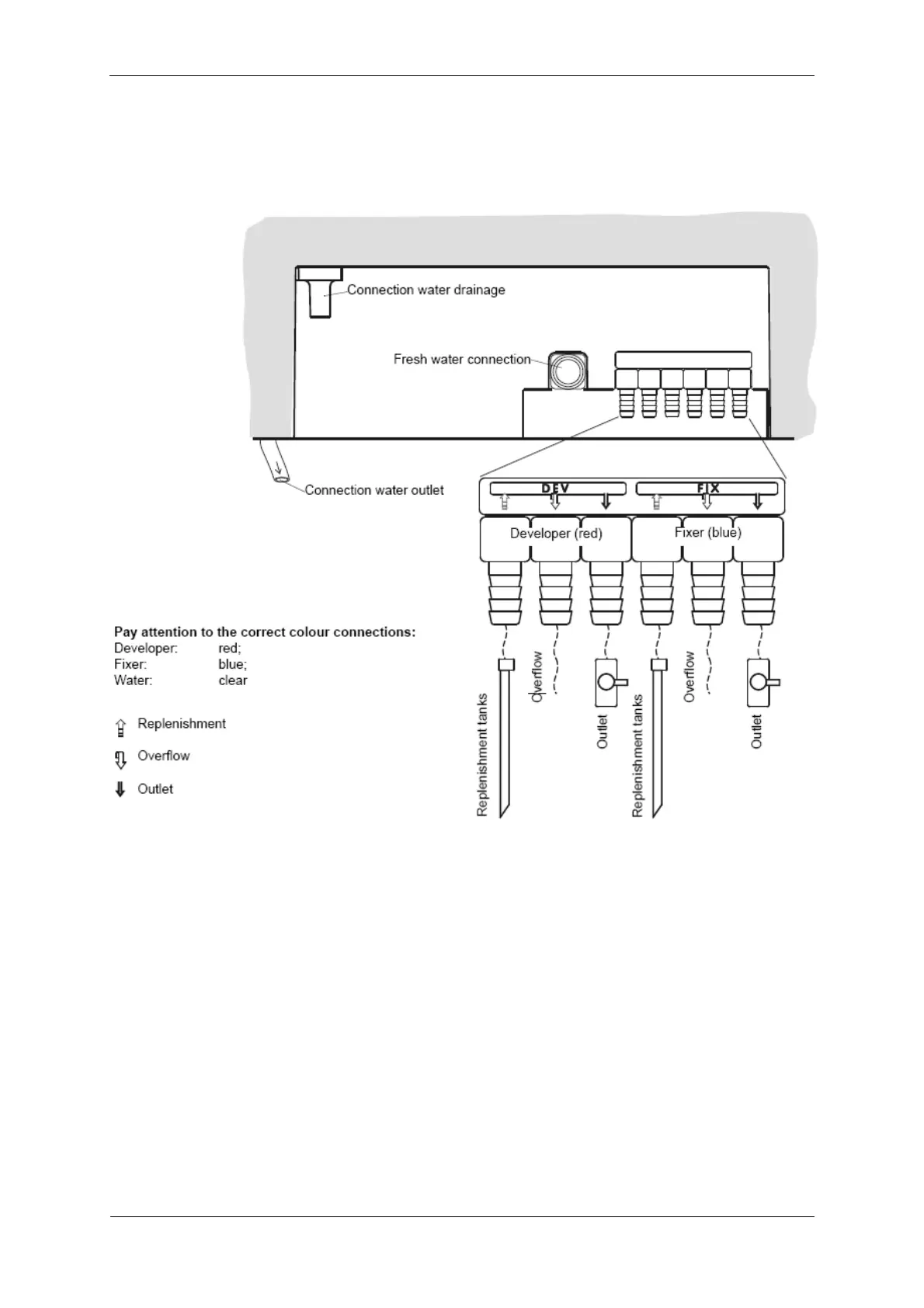 The overflow and drainage hoses from the developer and fixer should be guided into their respective