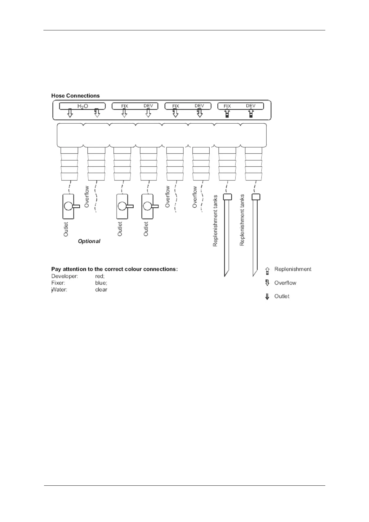The overflow and drainage hoses from the developer and fixer should be guided into their respective