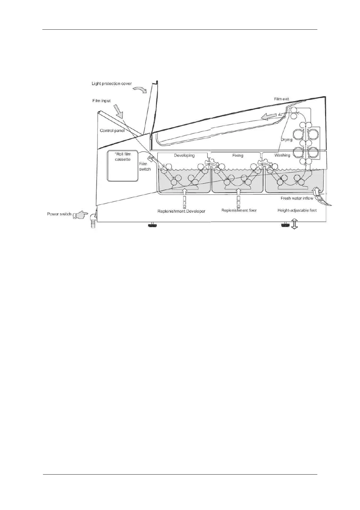 the chemicals on the transport rollers. Entry of the next film is possible at any time.