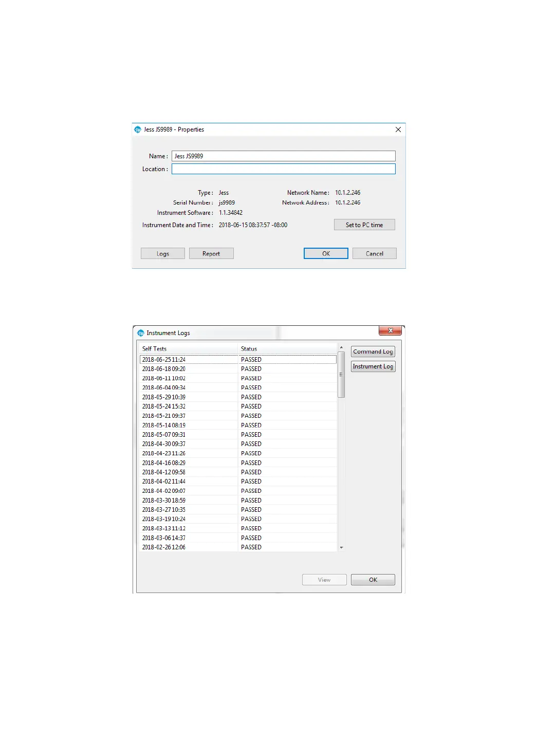 The table that displays shows the list of Self Test logs. You can also select Command Log or Instrument Log