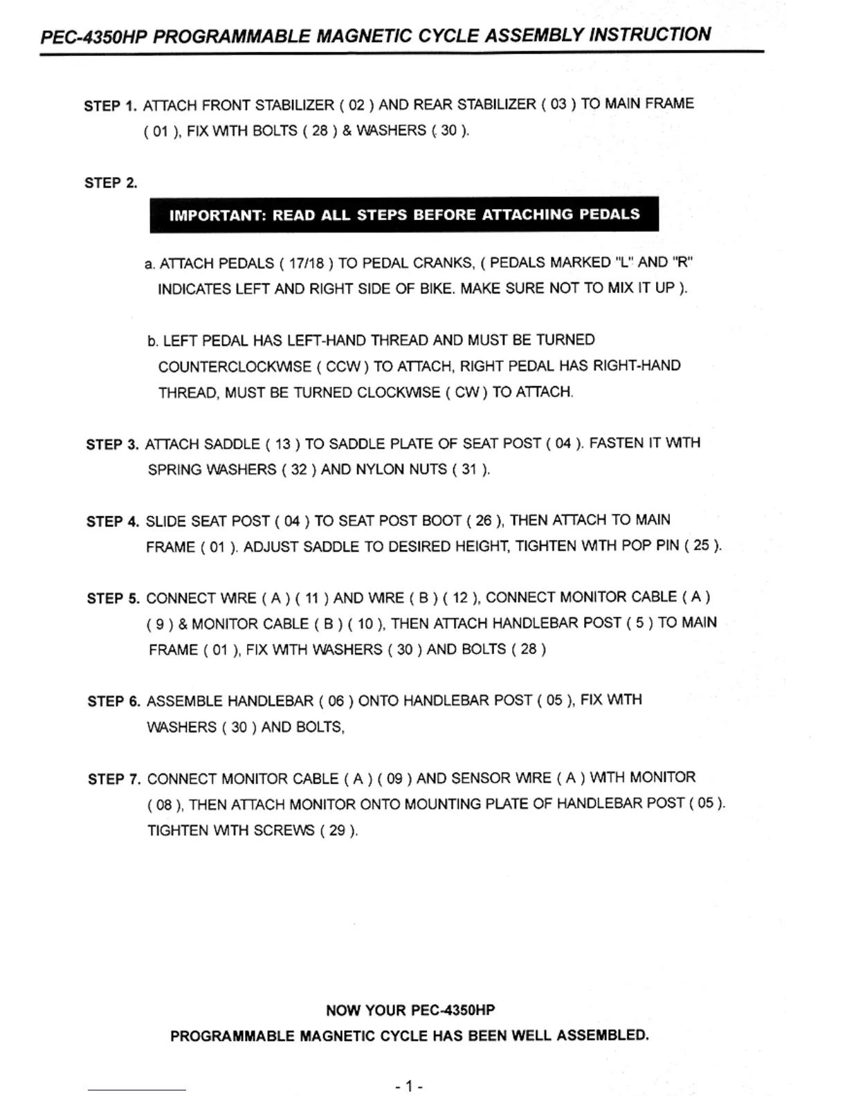 Proteus PEC-4350HP - Programmable Magnetic Cycle Assembly; Step 1: Attach Stabilizers; Step 2: Attach Pedals; Step 3: Attach Saddle and Seat Post