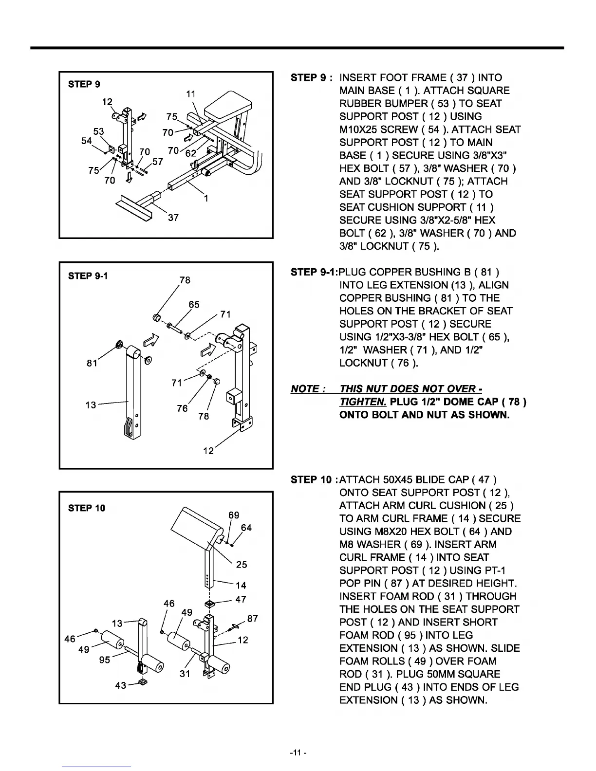 Proteus STUDIO-7 - Assembly Step 9: Foot Frame and Seat Support; Step 9-1: Leg Extension Bushing; Step 10: Arm Curl and Leg Extension