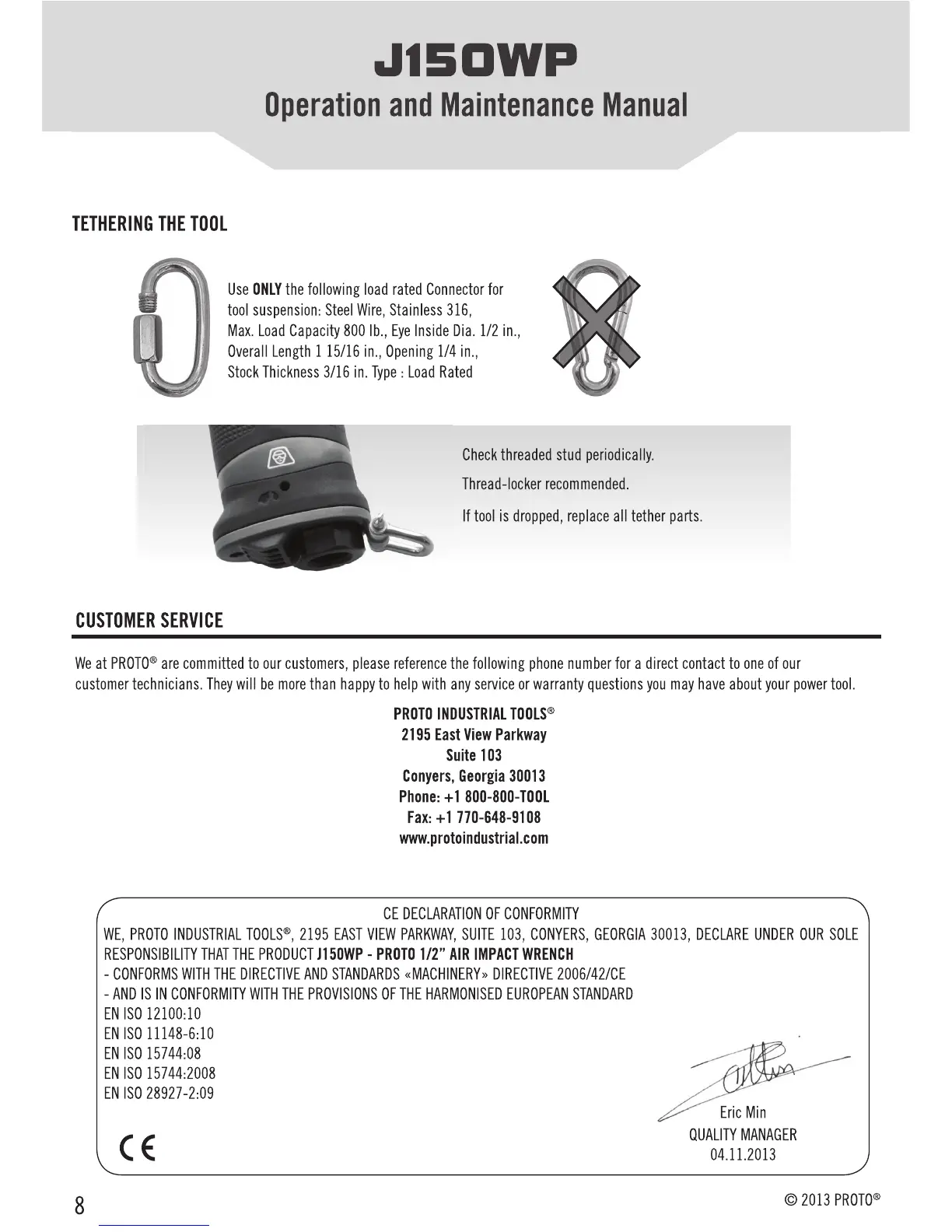 Proto J150WP - Tethering the Tool; Customer Service; CE Declaration of Conformity