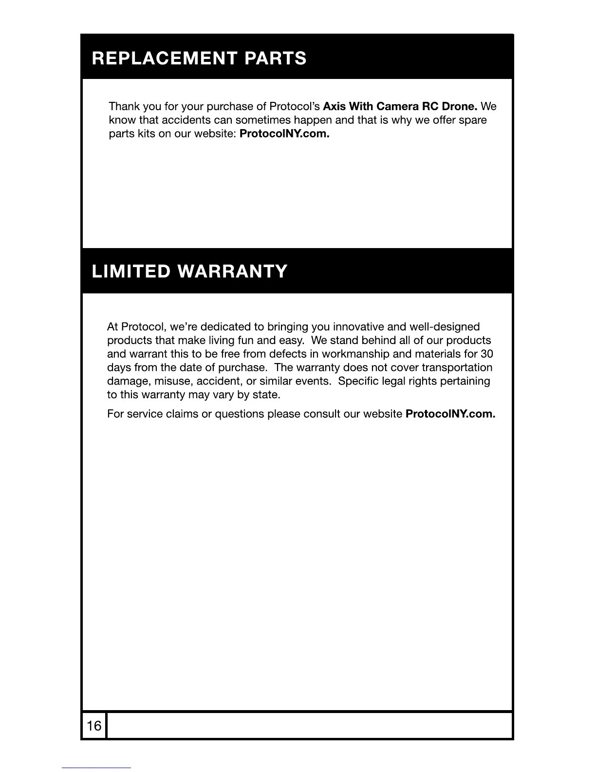 Protocol AXIS WITH CAMERA RC DRONE - Replacement Parts; Limited Warranty