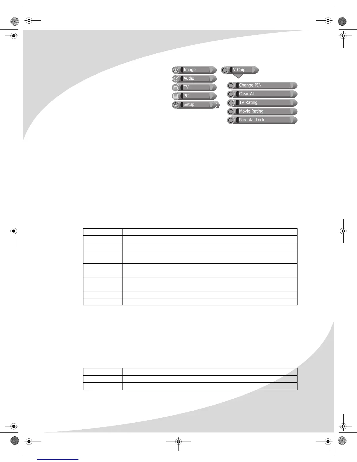 • TV Rating—A sub-menu that sets the TV PG rating level the V-Chip will block without a