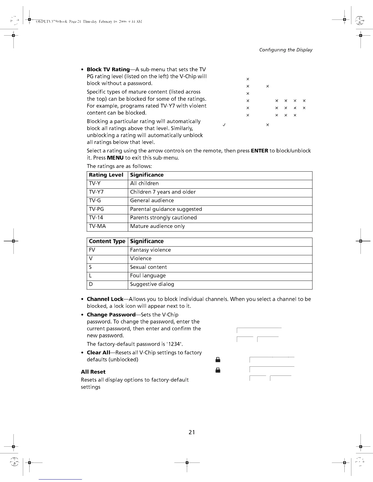 Select a rating using the arrow controls on the remote, then press ENTER to block/unblock