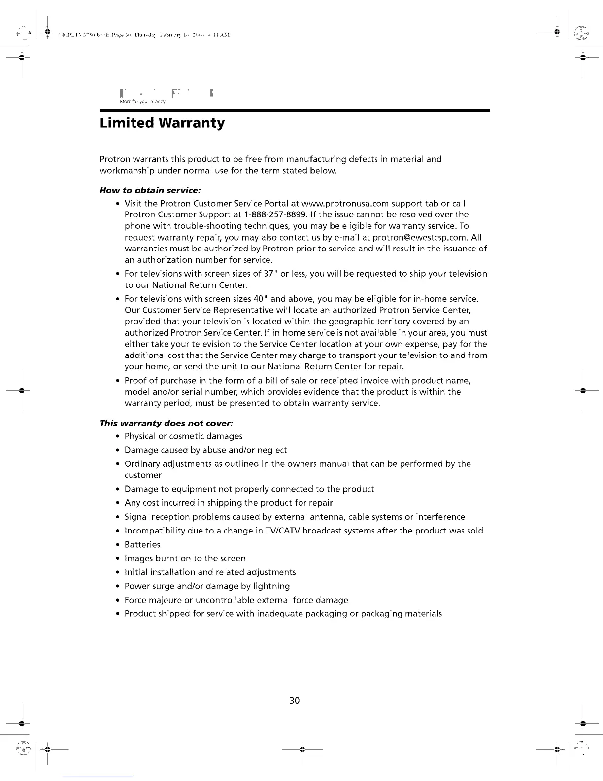 authorized Protron Service Center. If in-home service is not available in your area, you must