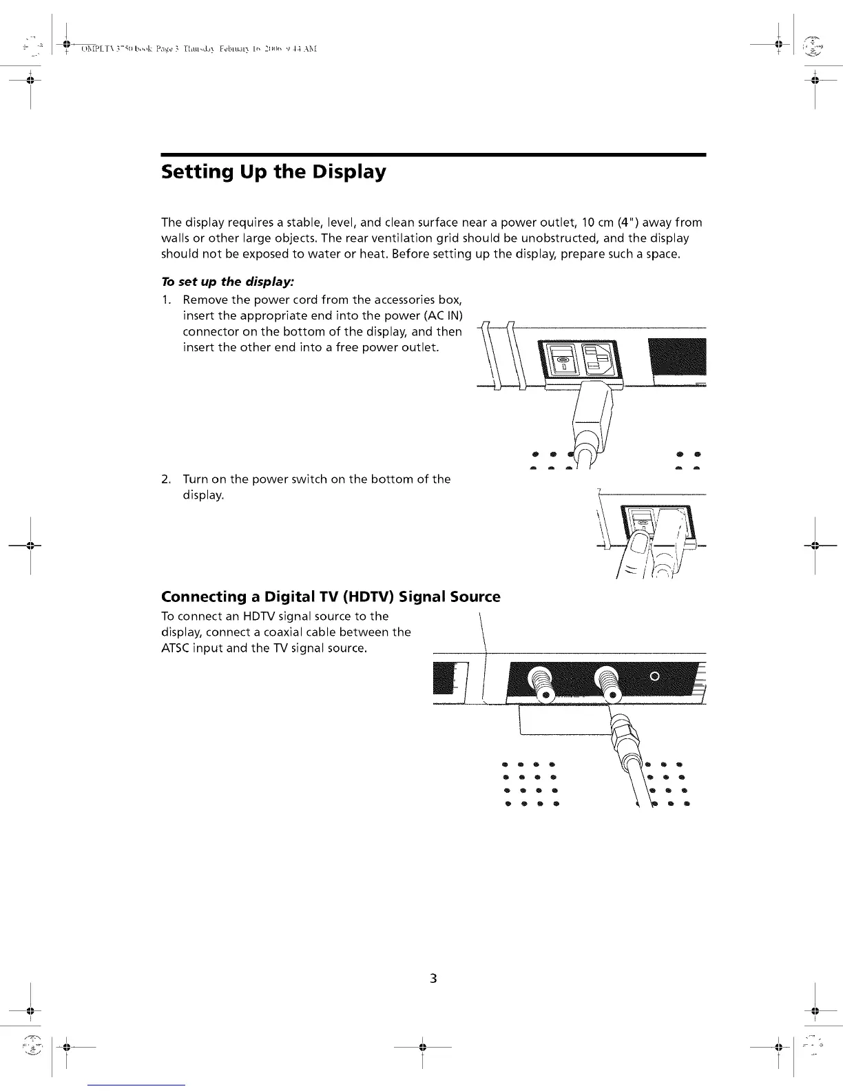 walls or other large objects. The rear ventilation grid should be unobstructed, and the display