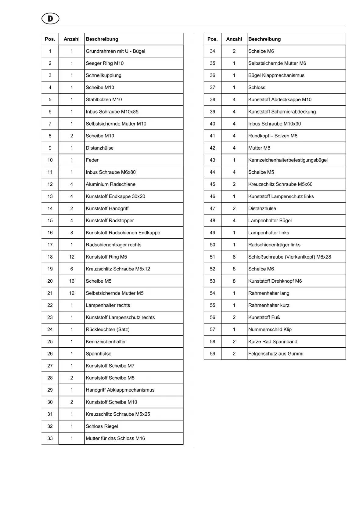 PROUSER DIAMANT - Übersicht Ersatzteile - Tabelle