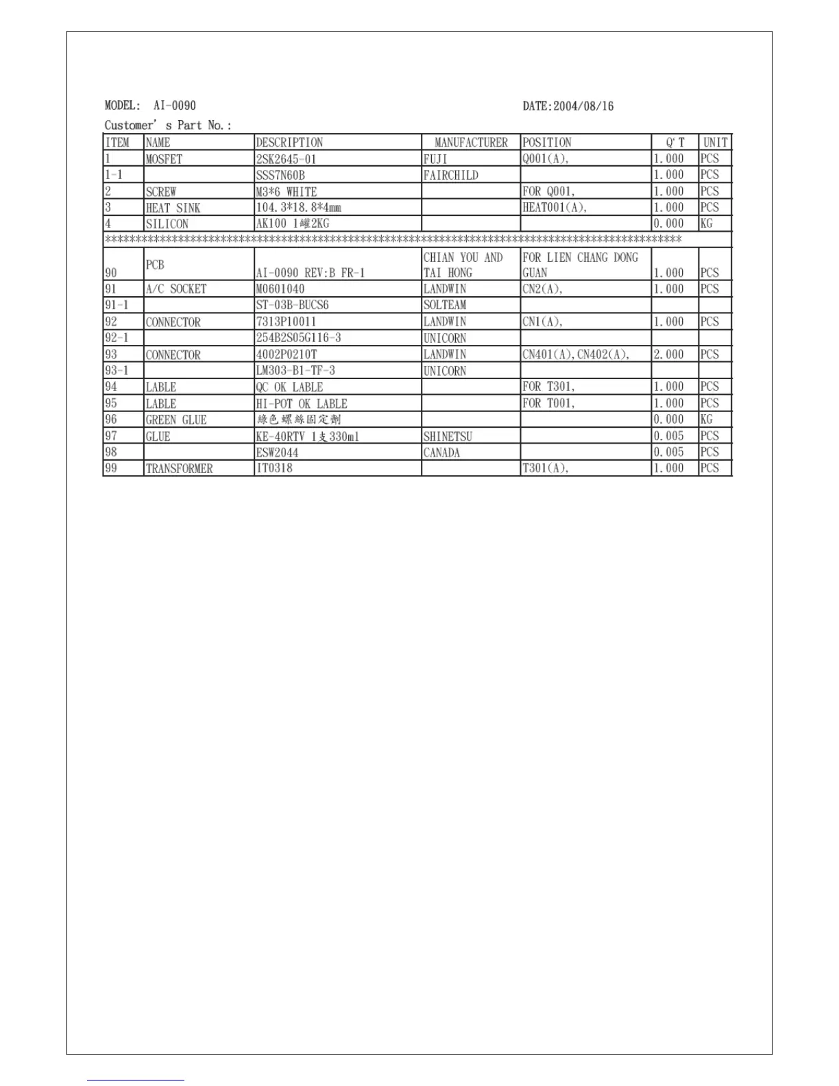 Proview UK513 - Power Board Component List (Continued); Transformers, Fuses, and Connectors