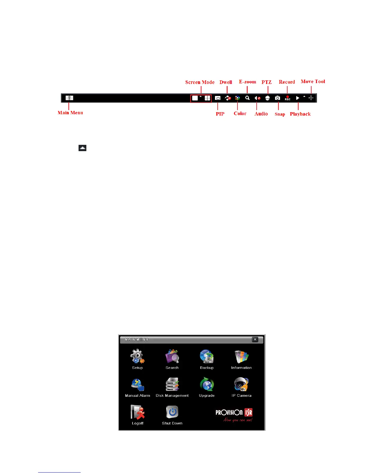 Click right mouse or press Exit/Fn button on the front panel to display the main menu toolbar on the bottom