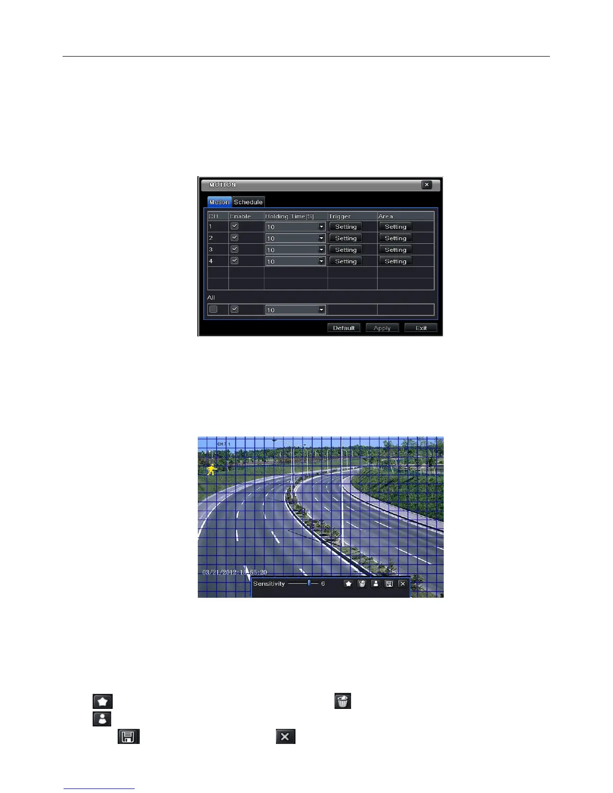 Motion includes two sub menus: motion and schedule. The steps to set motion alarm are as follows: