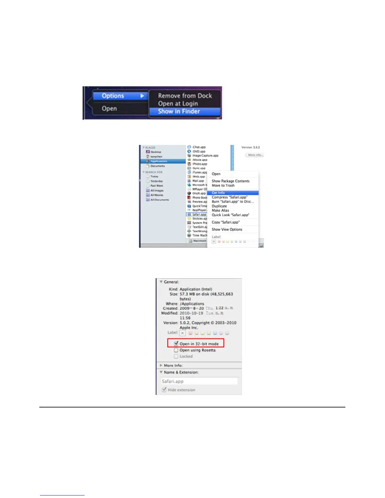 Note: Because the current plug-in version of client end just only supports 32-bit mode, so the safari browser shall start 32-bit mode. If