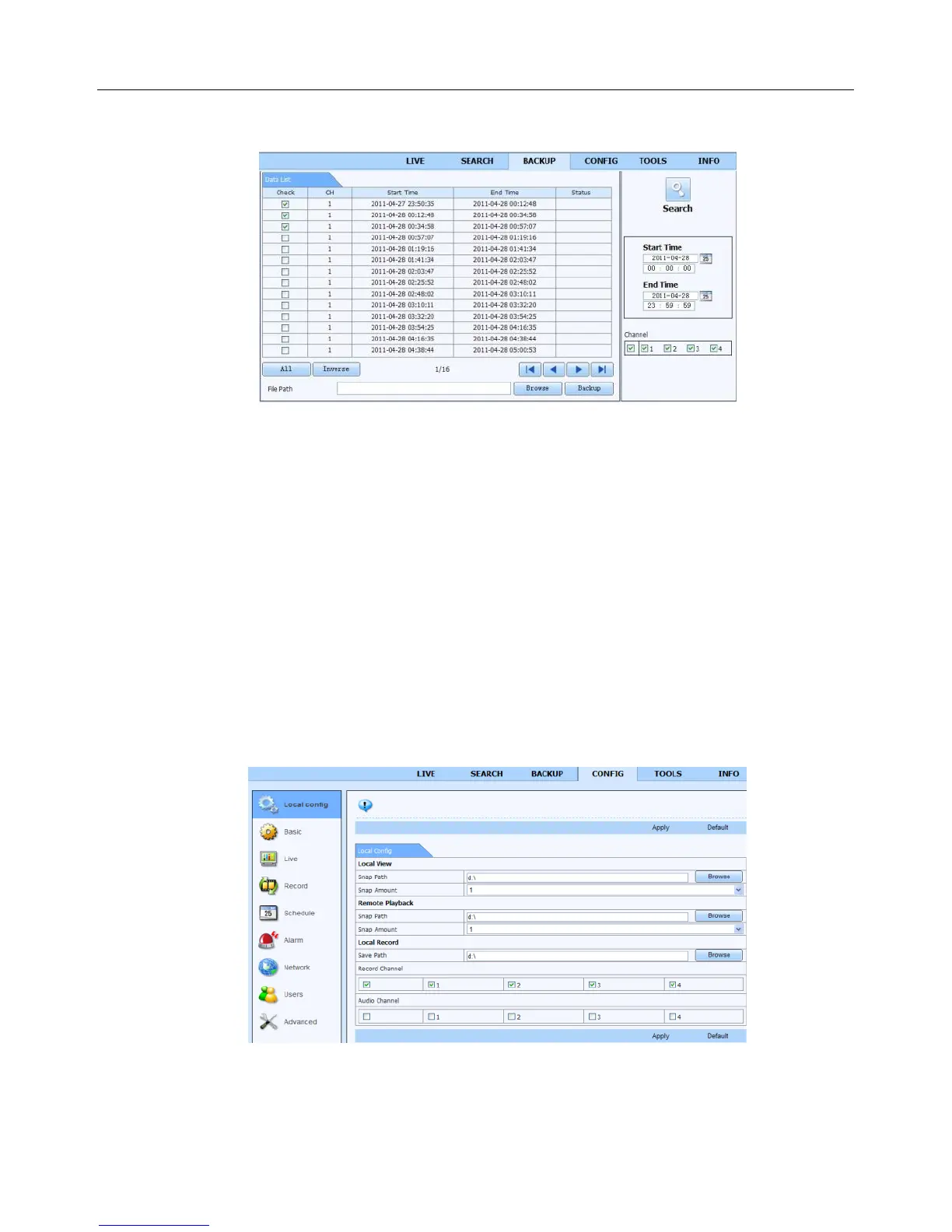 record configuration, schedule configuration, alarm configuration, network configuration and user