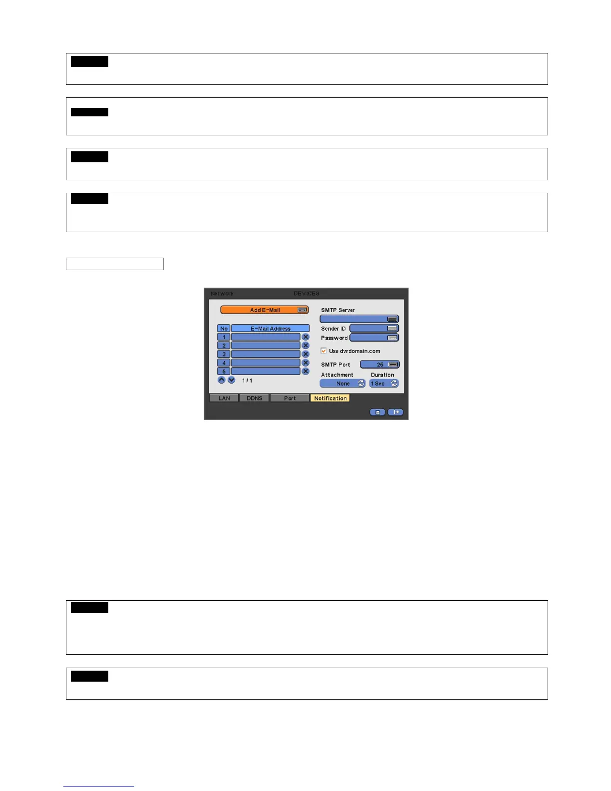 The Notification menu allows to send users the message of the Event occurred in DVR via E-Mail.
