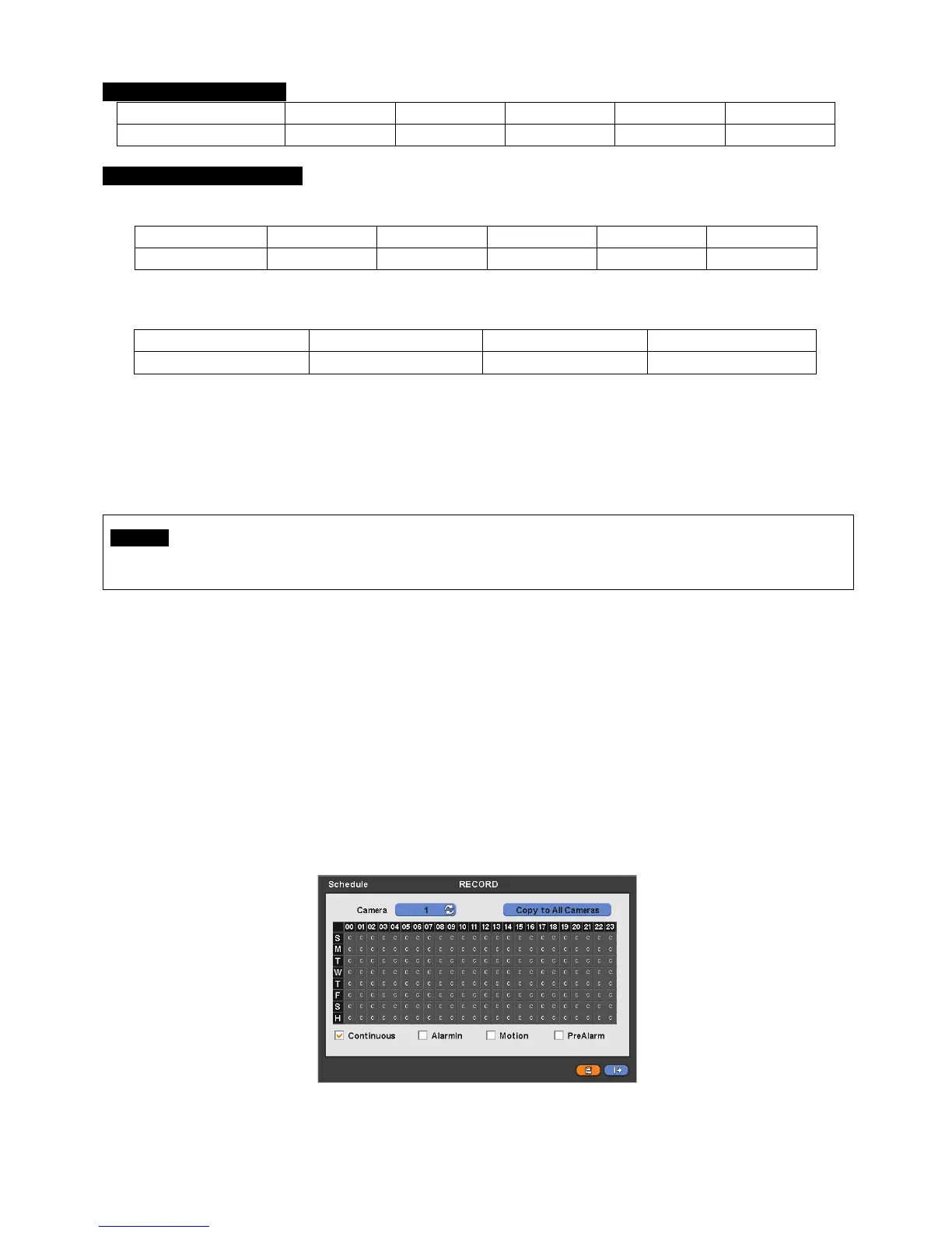 ① Mark a check box the desired recording mode in the schedule (i.e., Continuous, Alarm, Motion and PreAlarm)). If user