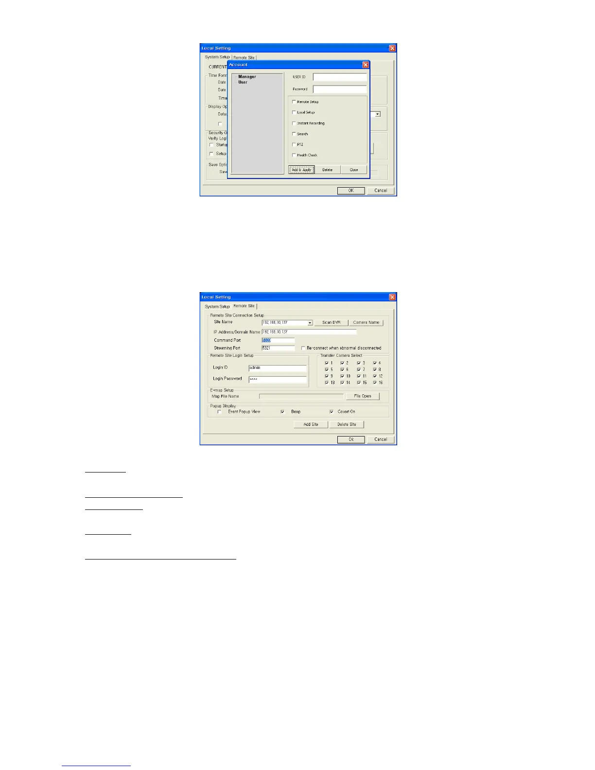 - Command Port: input Administrator’s number among port numbers set in DVR (check with SETUP>DEVICES>Network in