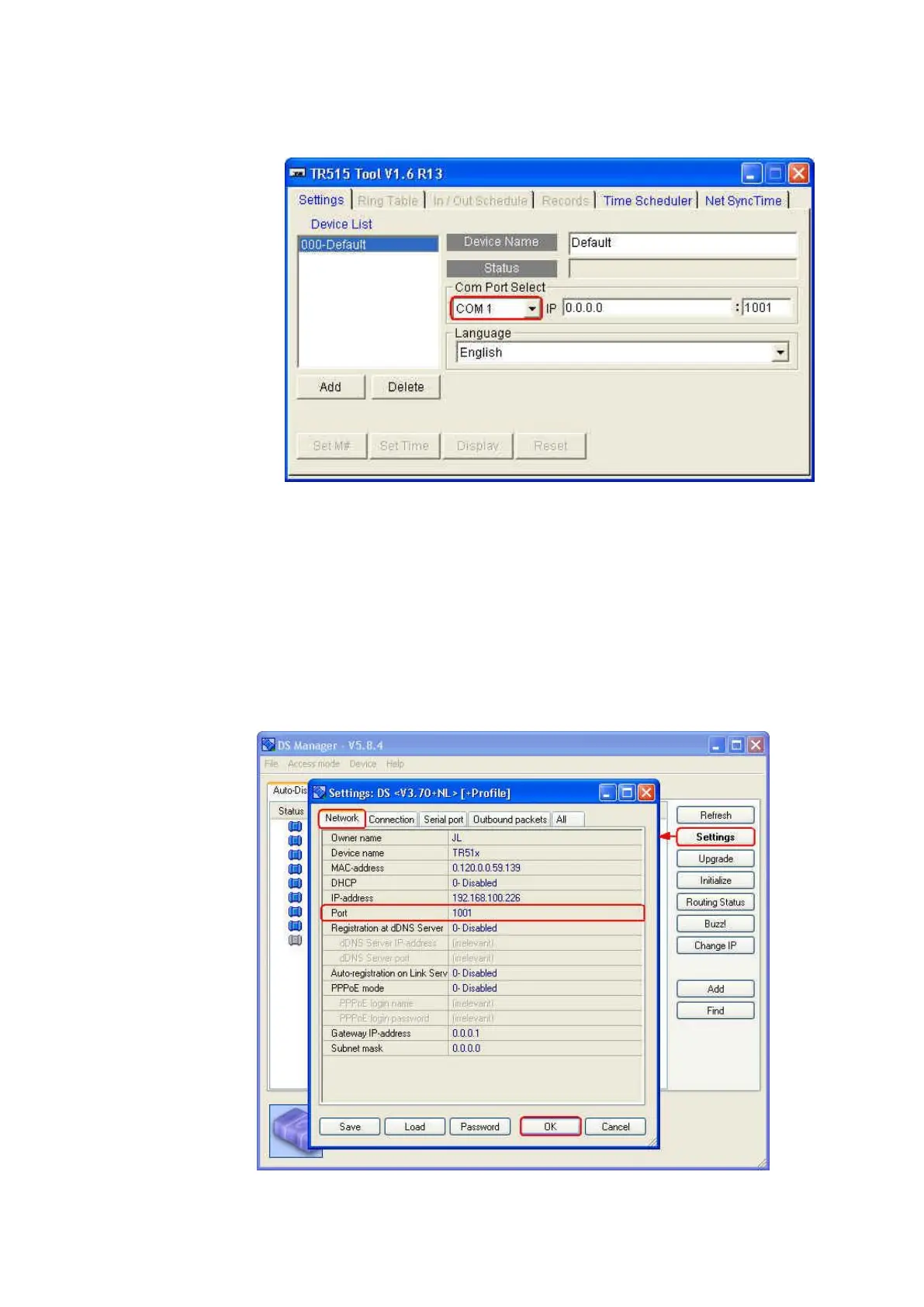 port number in the software DS Manager and the software TR515