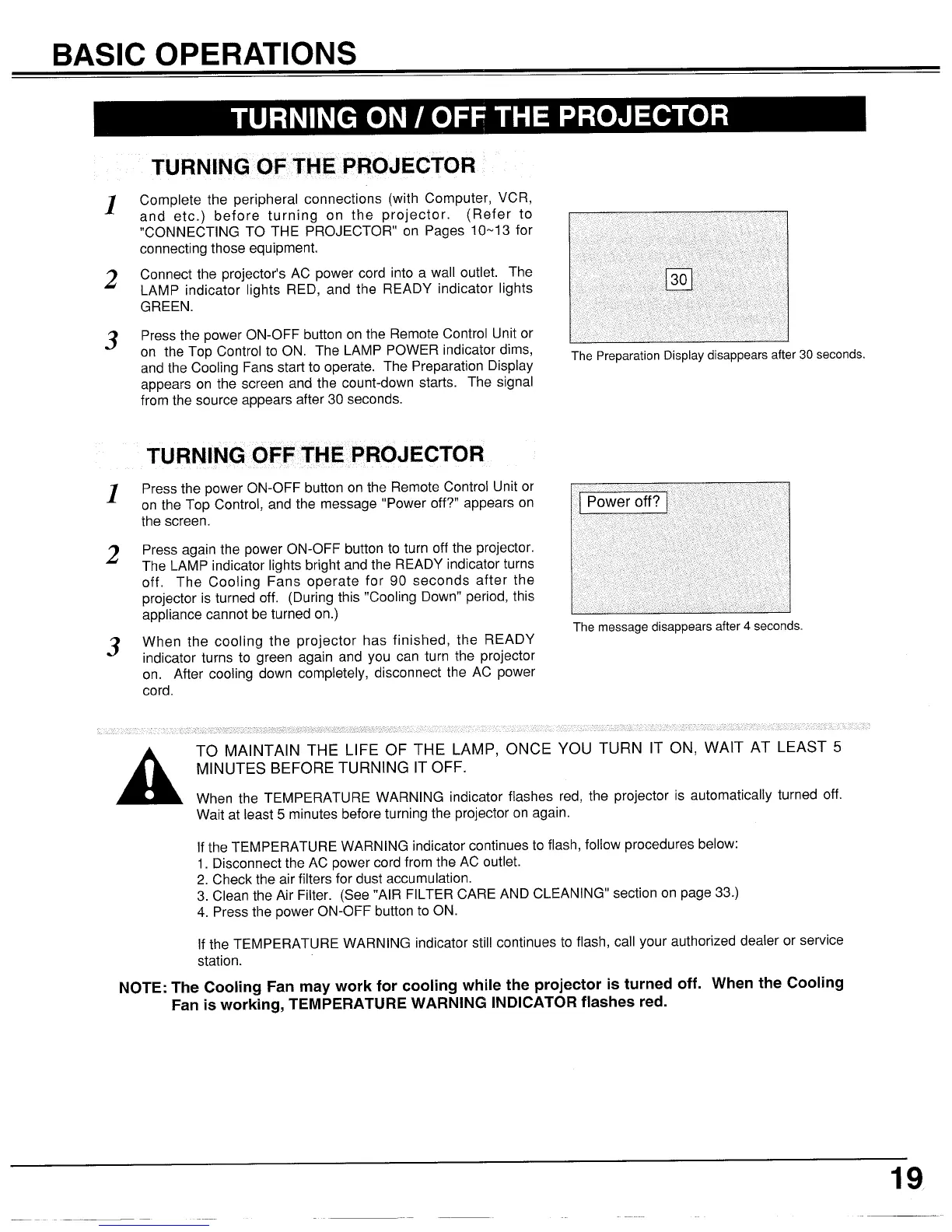 Proxima UltraLight LX2 - Basic Operations; Powering the Projector On and Off; Temperature Warning Indicator