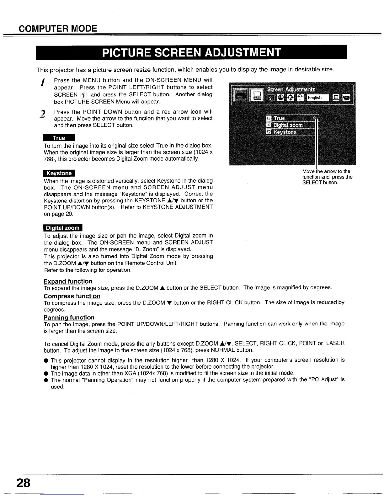 Proxima UltraLight LX2 - Picture Screen Adjustment; Image Resizing and Panning