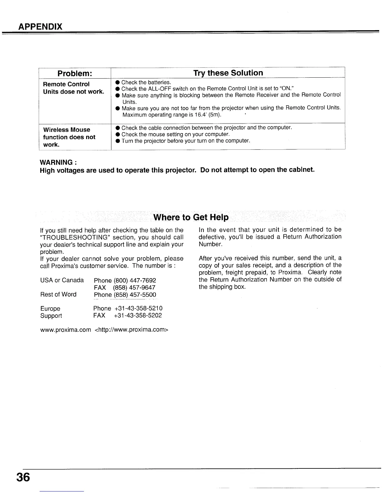 Proxima UltraLight LX2 - Further Assistance; Remote Control and Mouse Issues
