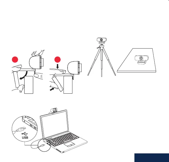 plane ou un trépied. Sur un écran, dépliez le clip exible pour xer la webcam sur