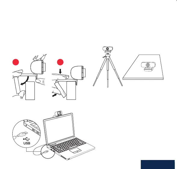 tripod. On a monitor, unfold the exible clip and place the webcam to grip the