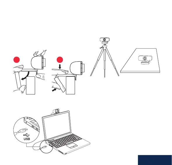 plane ou un trépied. Sur un écran, dépliez le clip exible pour xer la webcam sur
