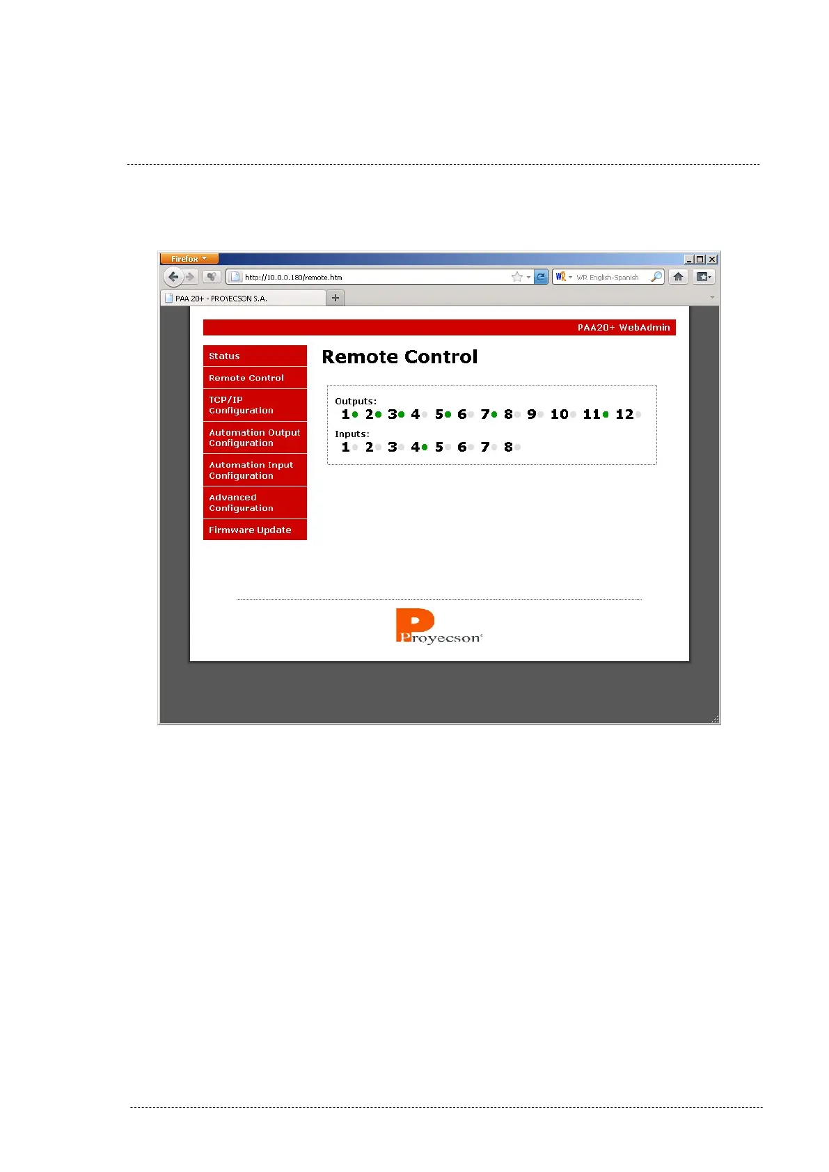 The remote control page allows you to switch the output relays and to